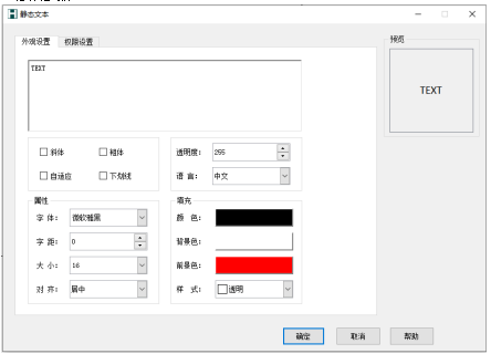 一、静态文本——操 作 1. 在控件栏中选择这个图标,会出现静态文本的属性对话框 2. 设置完属性值之后,我们点击确定按钮,鼠标的光标变为十字架,左键点击控件要放置的位置起点,点下之后同时拖动光标,确定控件的区域大小,松开左键,则绘制出了控件。 3. 鼠标左键双击控件或者点击工具栏中的图标,则弹出属性设置界面,用户可以修改参数。
