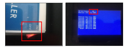 2、将电控柜的电源开关拨动“ON”处,确保触摸屏正常上电。上电后,触摸屏会自动更新画面,耐心等待1分钟左右,待触摸屏上方显示“END”字样后,代表下载画面完成。如下图所示: