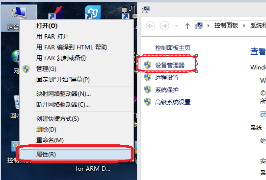 4、如果仍无法自动安装驱动,请打开桌面,这台电脑,右键依次选择属性,找到设备管理器,如下图: