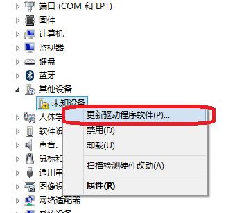 5、在感叹号或问号的设备中找到USB MSC,右键,选择更新驱动程序软件
