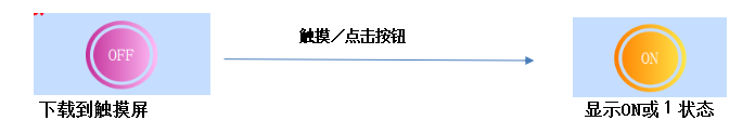 交替:下载到触摸屏后,触摸/点击该按钮把写入地址的位置为1/ON,再次触摸/点击该按钮吧写入地址的位